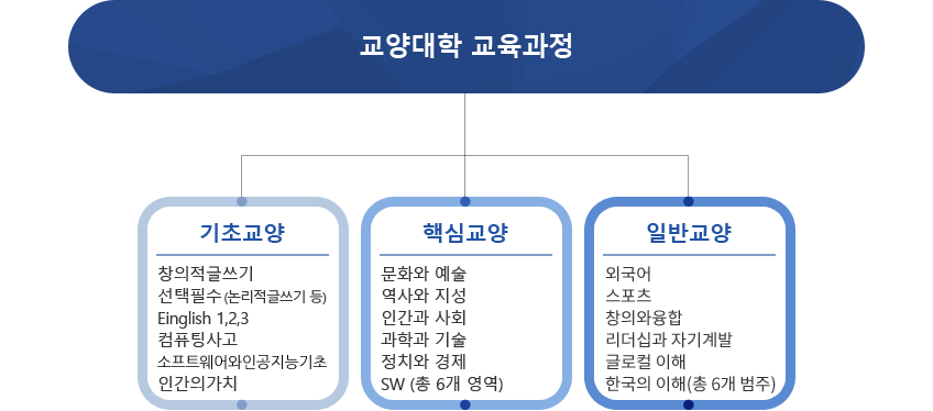 - 인간과 세계에 대한 폭넓은 이해와 성찰을 추구하는 지성인이 갖추어야 할 사고능력과 소양을 증진하기 위한 교육영역으로 구성한다.