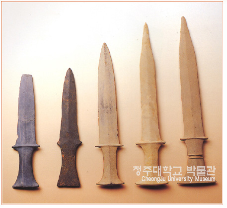 간돌검은 청동기시대의 대표적인 무기용 석기이지만 실용성보다는 부장용으로 많이 만들어졌다. 사진의 왼쪽 2점은 단단한 검은색 편마암을 재료로 삼았으며 사용한 흔적이 보인다. 그러나 오른쪽 3점은 재질이 무른 점으로 보아 전혀 사용되지 않고 권력자의 무덤에 부장하기 위해 제작된 것으로 보인다.