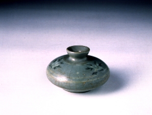 좁고 낮은 굽이 있고 동체가 납작하고 옆으로 벌어졌으며 각이진 작은 口部를 이루고 있는 전형적인 고려시대의 유병이다. 문양은 상감기법으로 어깨와 배부분에 2조선대를 두르고 그 사이에 문양을 상감하였으며 국화무늬를 새겼다. 유약은 綠色이 감도는 靑磁釉가 두껍게 시유되었고 광택이 좋다.
